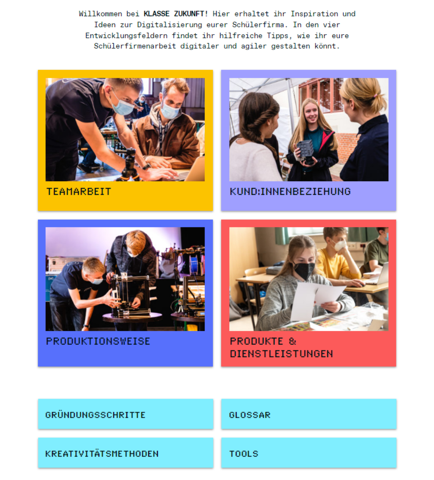 In den vier Entwicklungsfeldern Teamarbeit, Produktionsweise, Produkte & Dienstleistungen und Kund:innenbeziehungen geben wir Tipps, wie Schüler:innenfirmen digitaler gestaltet werden können. Die Website ist so aufgebaut, dass Schüler:innen selbst mit ihr arbeiten und Ideen eigenständig umsetzen können.
