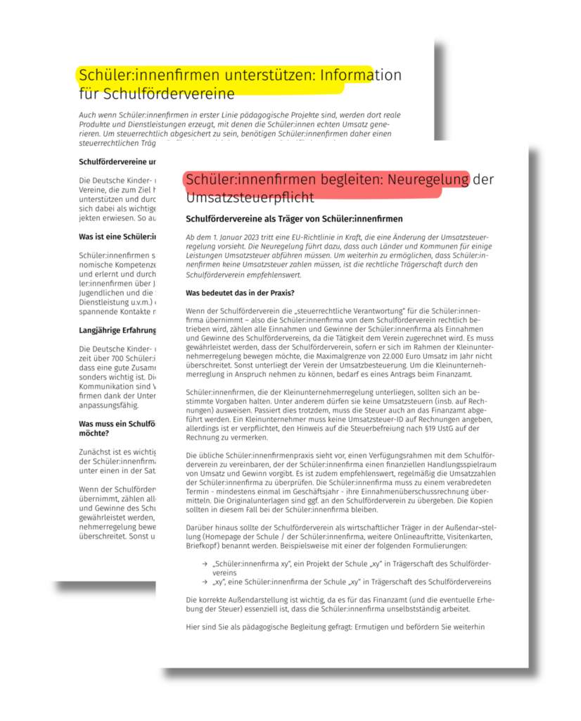 Auch wenn Schüler:innenfirmen in erster Linie pädagogische Projekte sind, werden dort reale Produkte und Dienstleistungen erzeugt, mit denen die Schüler:innen echten Umsatz generieren. Um steuerrechtlich abgesichert zu sein, benötigen Schüler:innenfirmen daher einen steuerrechtlichen Träger. Dafür eignet sich besonders der Schulförderverein. Das Infoblatt thematisiert folgende Schwerpunkte: